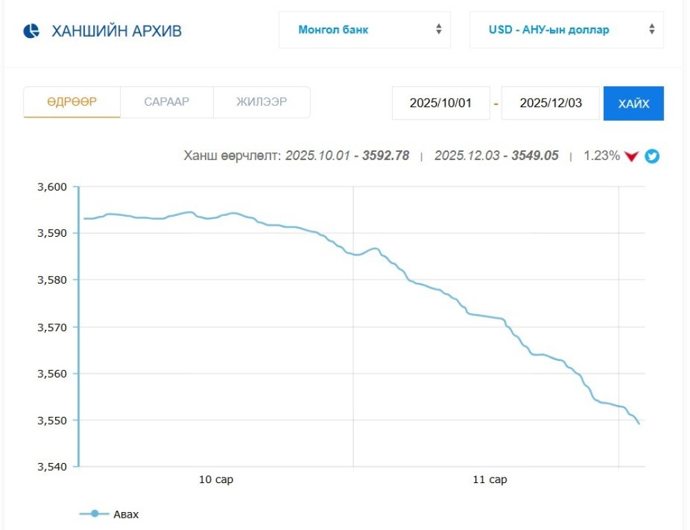 Гадаад валютын улсын нөөц өсөх нь дотоодын эдийн засаг, санхүүгийн зах зээлийн тогтвортой байдлыг сайжруулах, Төв банкны үндсэн зорилт буюу төгрөгийн тогтвортой байдлыг хангах өндөр ач холбогдолтой. Сүүлийн хоёр сард төгрөгийн ханш ам.долларын эсрэг аажим чангарсныг дээрх зургаас харж болно.