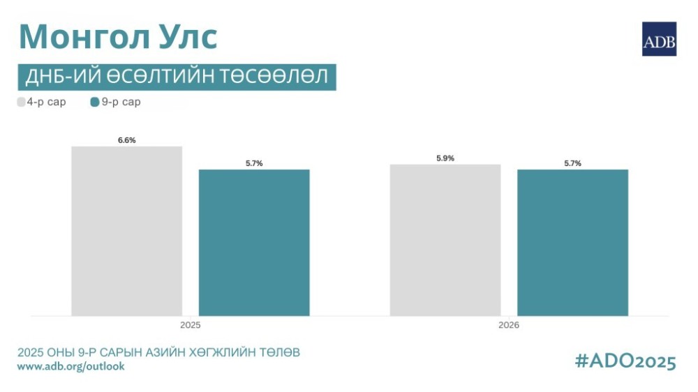 Тус банк энэ сарын Азийн хөгжлийн төлөв тайландаа Монголын эдийн засаг 2025 болон 2026 онд тус тус 5.7%-иар өснө гэж төсөөлсөн өмнөх төсөөлөл болох 6.6% болон 5.9%-иас буурсан байна.