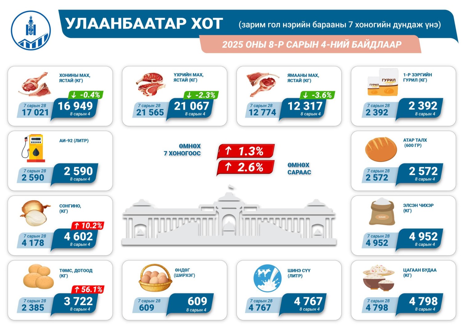 Улаанбаатар хотод өчигдөр (2025.08.04)-ний байдлаар гол нэрийн зарим барааны үнэ өмнөх сараас 2.6 хувь, өмнөх 7 хоногоос 1.3 хувиар тус тус өсжээ.