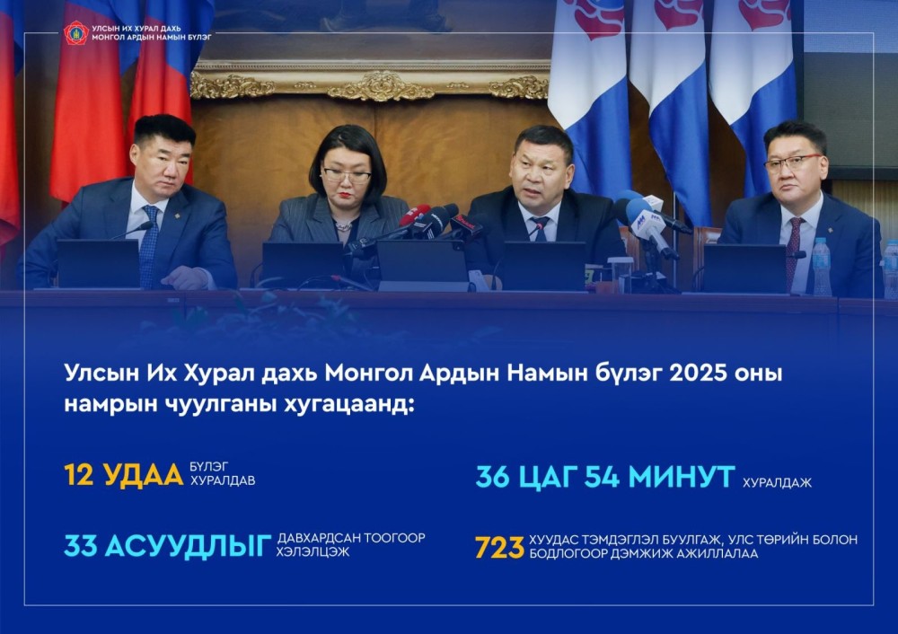 УИХ-ын 2025 оны намрын ээлжит чуулганы хугацаанд МАН-ын бүлэг нийт 12 удаа хуралдаж, давхардсан тоогоор 33 хууль тогтоолын төсөл, бодлогын баримт бичиг, цаг үеийн тулгамдсан асуудлуудыг хэлэлцжээ.