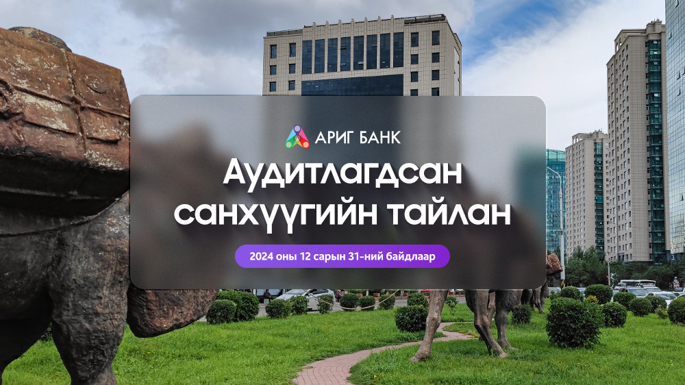 Ариг банк 2024 оны санхүүгийн тайлангаа ОУ-д хүлээн зөвшөөрөгдсөн “ЭРНСТ ЭНД ЯНГ МОНГОЛИЯ АУДИТ” ХХК-аар хийлгэж Банкны тухай хуулийн 38-р зүйлд заасны дагуу харилцагч, үйлчлүүлэгчид болон түнш байгууллагууддаа танилцуулж байна.