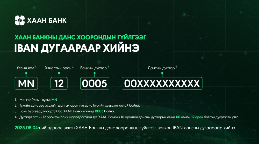 2025 оны 8-р сарын 4-ний өдрөөс эхлэн ХААН Банкны данс хоорондын гүйлгээг IBAN дансны дугаараар хийх болсон тухай урьдчилан мэдээлж байна.