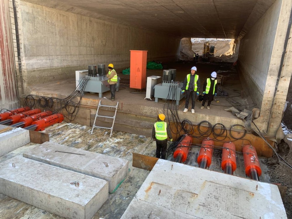 Өөрөөр хэлбэл, урьдчилан цутгасан 2200 тонн жинтэй туннелийг 500 тонны даацтай найман ширхэг домкрат, 76 литрийн тосны насос бүхий хоёр иж бүрдэл төхөөрөмжийн тусламжтайгаар түлхэж буй. Ажлын суурийг C25 маркийн төмөр бетон материалаар цутгаж, 4 метрийн өргөнтэй гулсах тавцан дээр уг ажлыг гүйцэтгэж байна.