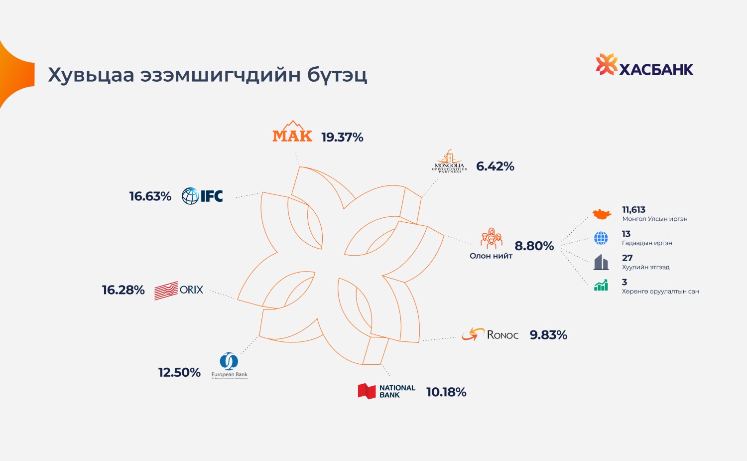 ХасБанк байгуулагдсан цагаасаа эхлэн хувьцаа эзэмшлийн хэт төвлөрлөөс зайлсхийж, засаглалын эрүүл бүтцийг хадгалсаар ирсэн бөгөөд үүгээрээ бид Монголын банк санхүүгийн салбарт сайн засаглал, тогтвортой өсөлт, найдвартай байдал, эрсдэлийн удирдлагын зөв жишиг тогтоогч байсаар ирсэн, цаашид ч байх болно.