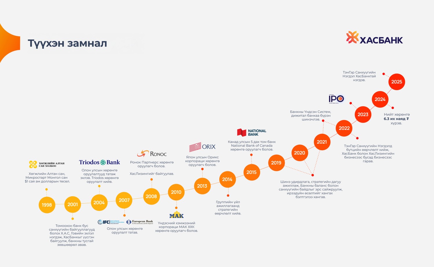 НҮБ-ын Хөгжлийн хөтөлбөрийн “Майкро-Старт” төслөөс анх гараагаа авч Монгол Улсын системийн банк болтлоо өсөн тэлсэн энэ түүхэн замналын хугацаанд Монголын Алт Корпорац, Олон Улсын Санхүүгийн Корпорац (IFC), Японы ORIX, Европын Сэргээн Босголт Хөгжлийн Банк (EBRD), Канадын Үндэсний Банк зэрэг дэлхийд хүлээн зөвшөөрөгдсөн байгууллагууд ХасБанканд хөрөнгө оруулж, хамтран ажилласан нь зөвхөн ХасБанк төдийгүй Монголын банкны салбарын хөгжилд үнэтэй хувь нэмэр оруулж, тогтвортой өсөлтийн суурь болсон.