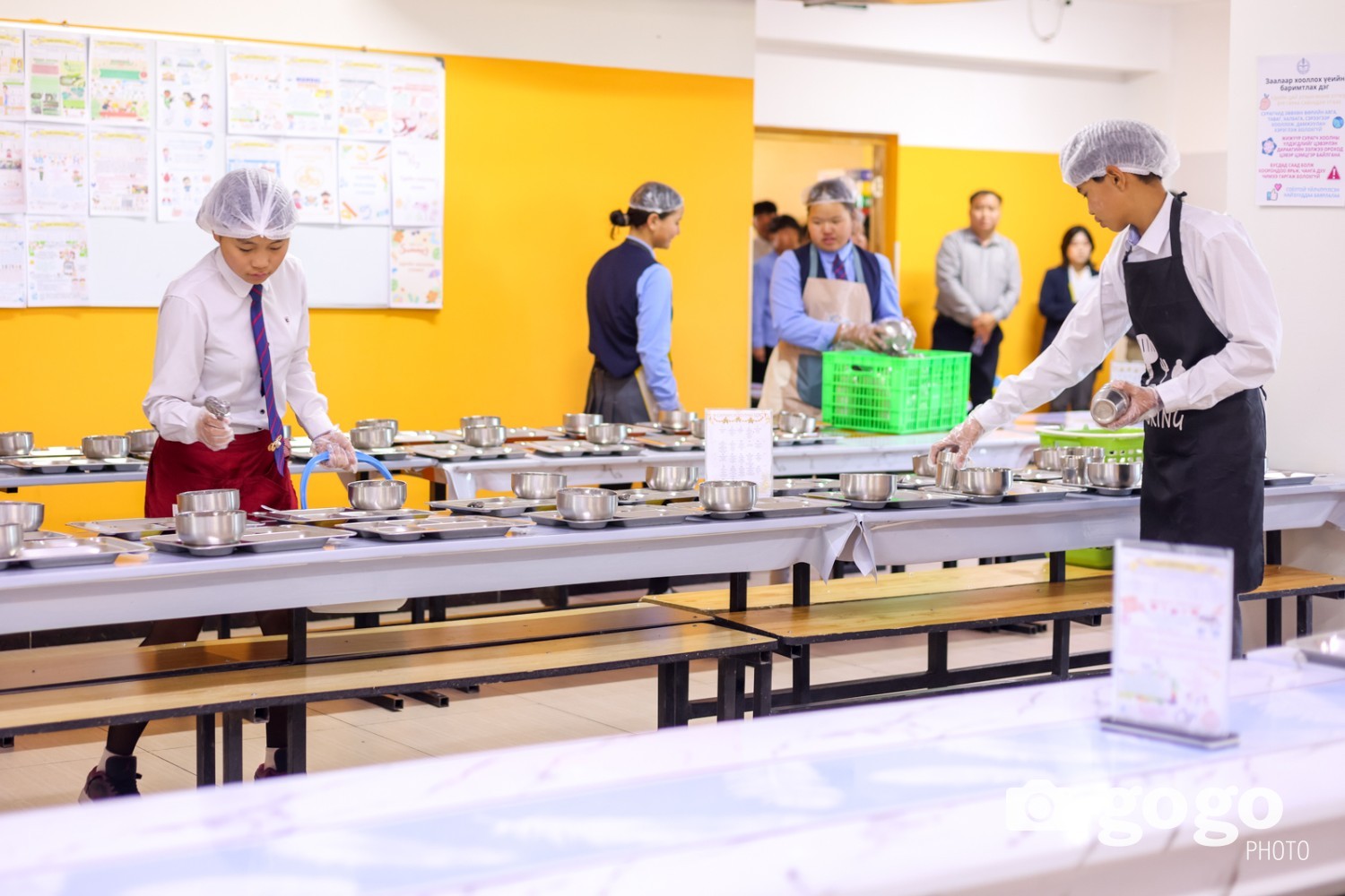 - Манай сургууль 2015 онд байгуулагдаад нэг жилийн хугацаанд түрээсийн гал тогоотой байсан. 2016 оноос сургууль үдийн хоолоо өөрсдөө бэлтгэж эхэлсэн. 7 хоногийн таван өдрийн 3-т нь халуун хоол, бусад өдөр нь бэлэн бүтээгдэхүүн өгдөг байв. Тухайн үед нэг хүүхдийн үдийн хоолны зардал 600₮ байсныг 900₮ болгосон. Ингэснээр нийт таван өдөр халуун хоолтой болгов. Дараа нь нэг хүүхдийн төсөв 1500₮ болж нэмэгдэхэд үдийн хоолыг иж бүрдэл хэлбэрээр өгч эхэлсэн. Одоо нэг хүүхдийн зардал 2500₮ байгаа ба 1-5-р ангийн 700 гаруй хүүхэд хамрагдаж байна. Сурагчид дунд ангид орохоороо үдийн хоолоо үгүйлдэг. Мөн дунд, ахлах ангийнхан олон цагийн хичээл, дугуйлан сургалт гээд сургууль дээрээ байх цаг нь уртасдаг учир "Хүүхдийн мөнгөө өөртөө зарцуулъя" уриалгыг гаргаж дунд, ахлах ангийн хүүхдүүдийн эцэг эхчүүдийн зүгээс хоолны мөнгийг нь авч, өнгөрсөн хичээлийн жилээс эхлэн үдийн хоолонд хамруулж байна. Тэгэхээр ахлах, дунд ангийн 200 гаруй хүүхэд үдийн хоолонд хамрагдаж байна гэсэн үг.