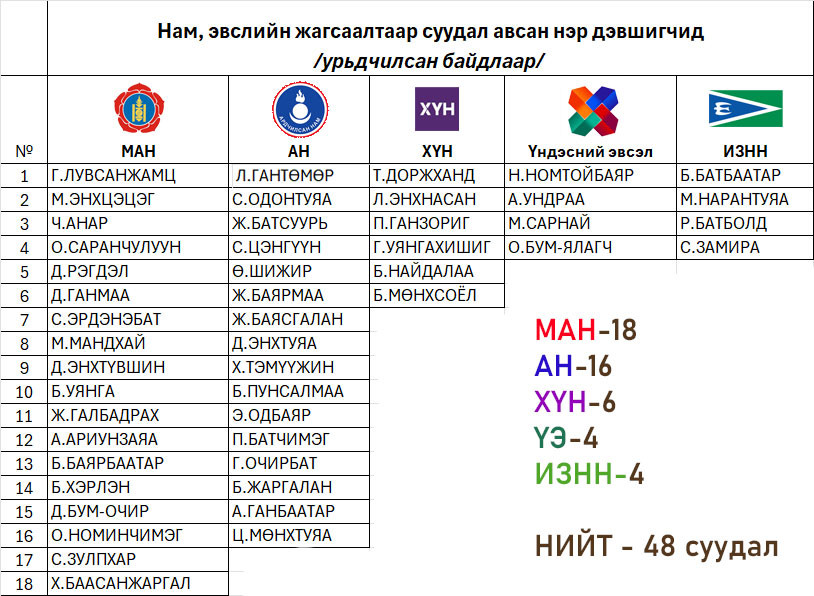 Тойрог болон жагсаалтаар суудал авах нэр дэвшигчдийн дэлгэрэнгүйг ЭНД дарж хүлээн авна уу.