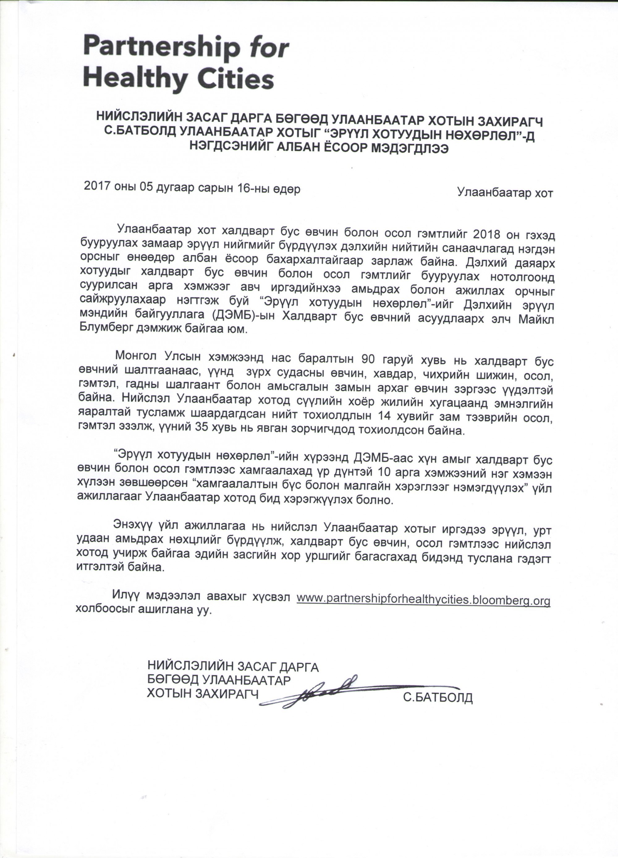Нийслэлийн Засаг дарга бөгөөд Улаанбаатар хотын захирагч С.Батболд Улаанбаатар хотыг "Эрүүл Хотуудын Нөхөрлөл"-д нэгдсэнийг албан ёсоор мэдэгдлээ.