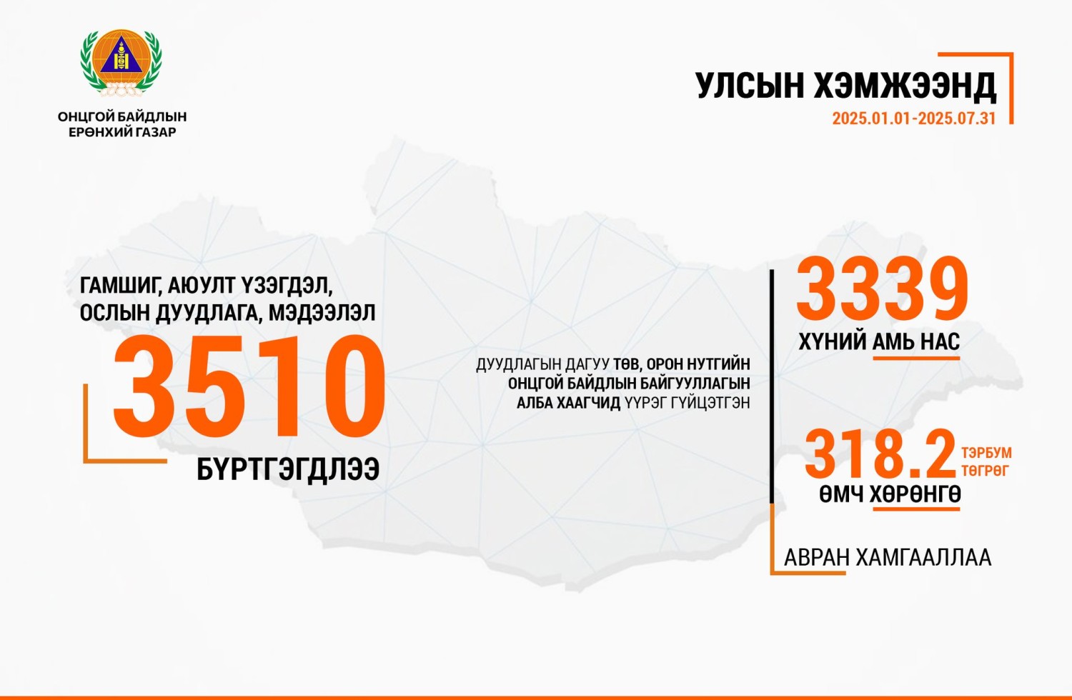 Улсын хэмжээнд он гарсаар долоодугаар сарын байдлаар 3510 удаагийн гамшиг, аюулт үзэгдэл, ослын дуудлага, мэдээлэл бүртгэгдлээ.