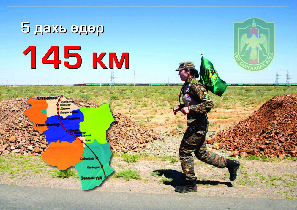 Хилийн 0108 дугаар ангийн спортын мастер, ахлах ахлагч Т.Рэнцэнбадам өмнөд хилээс умард хил хүртэл 1100 км-ын холын гүйлт хийж буй.