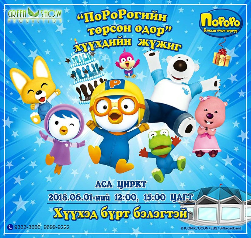 “Green show production” нь Эх үрсийн баярыг тохиолдуулан хүүхэд багачууддаа зориулан БНСУ-ын "ICONIX" компаний “Пороро” хүүхэлдэйн киног албан ёсны онцгой эрхтэйгээр “ПОРОРОГИЙН ТӨРСӨН ӨДӨР” хүүхдийн жүжиг болгон тайзнаа тавих гэж байна. Уг жүжиг 06-р сарын 1-ний өдөр АСА циркэд 12:00, 15:00 цагуудад хоёрхон удаа тоглогдоно.