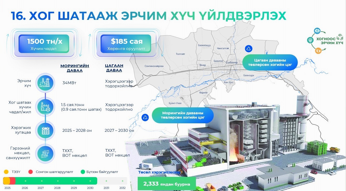Улаанбаатар хотыг хөгжүүлэх 24 мега төслийн хүрээнд Морингийн даваа болон Цагаан давааны төвлөрсөн хогийн цэгт хог шатааж эрчим хүч үйлдвэрлэх төслийг хэрэгжүүлнэ. Энэ хүрээнд та Морингийн давааны төвлөрсөн хогийн цэгт ахуйн хог хаягдлыг шатааж, эрчим хүч гаргах дэвшилтэт технологи бүхий үйлдвэр байгуулахыг дэмжих эсэх саналаа https://vote.ulaanbaatar.mn/home холбоосоор өгнө үү. Санал асуулга тавдугаар сарын 8-30-ны өдрийг дуустал үргэлжилнэ.