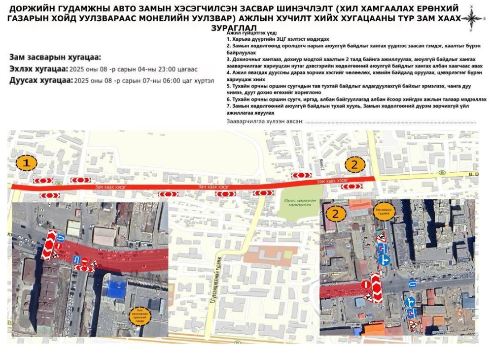 Доржийн гудамжны авто замыг засах тул Хил хамгаалах ерөнхий газрын хойд уулзвараас Монелийн уулзвар хүртэл авто замыг хаана. Өнгө асфальт бетон хучилт, тэмдэглэгээний ажил хийнэ.