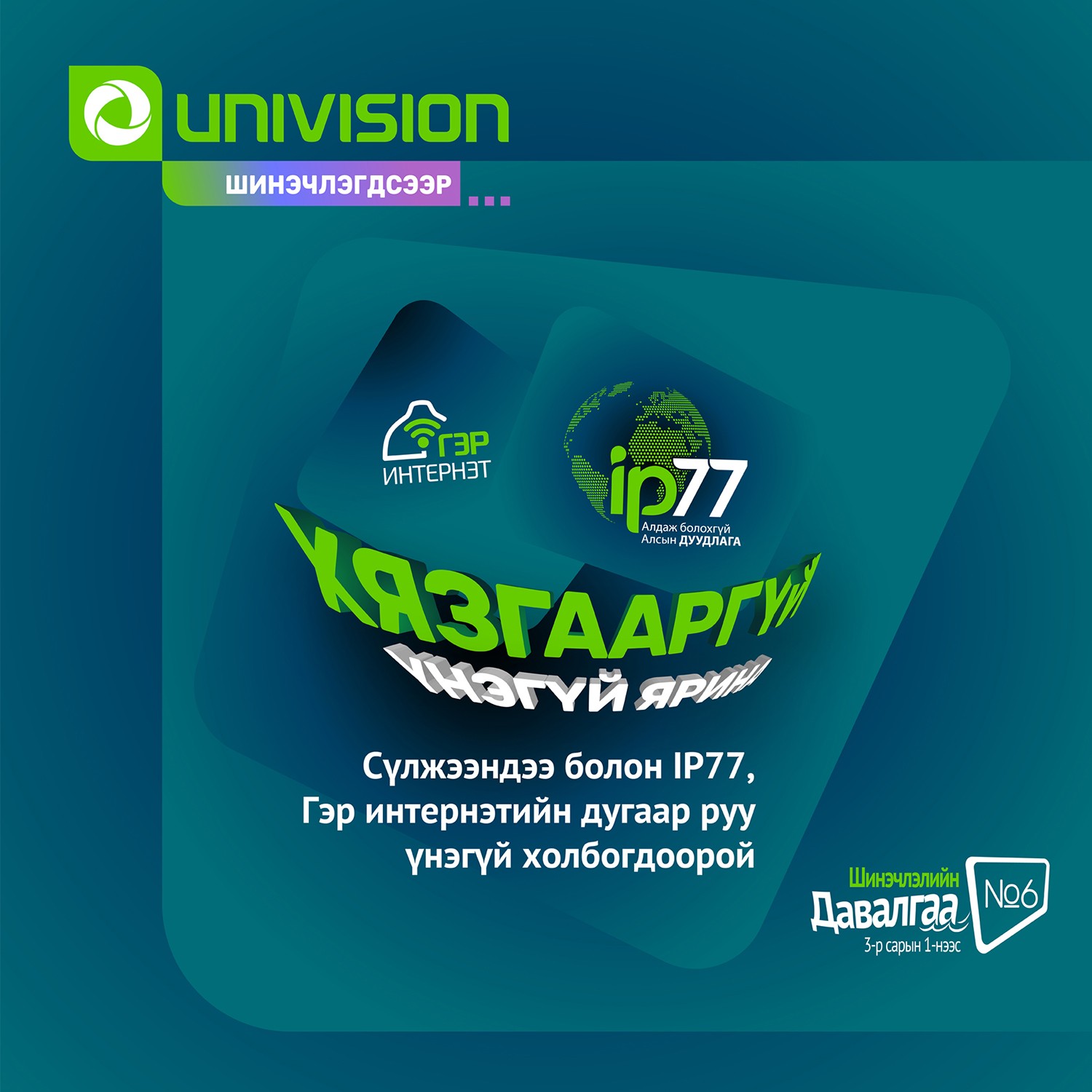 Дэлхийн технологийн гайхамшиг болсон IPTV, интернэт, суурин утасны гурвалсан үйлчилгээг Монголынхоо хэрэглэгчдэд түрүүлж хүргэсэн Юнивишн компани ШИНЭЧЛЭЛИЙН ДАВАЛГАА-г эхлүүллээ. Юнивишнийн өрхийн гурвалсан үйлчилгээний хэрэглэгчдэд илүү олон СУВАГ, илүү олон КИНО, илүү олон СУПЕР БОЛОМЖ-ууд нээгдэж байгаа юм. ШИНЭЧЛЭЛИЙН ДАВАЛГАА танд дараах боломжуудыг санал болгож байна.